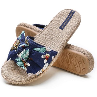 Summer House Slippers for Women with Floral Bow Linen Open Toe House Shoes Flax Indoor Slip
