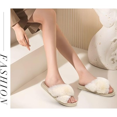 Womens Fuzzy Slides Fluff Faux Fur Cross Slippers Open Toe Yoga Mat House Slippers Sandals